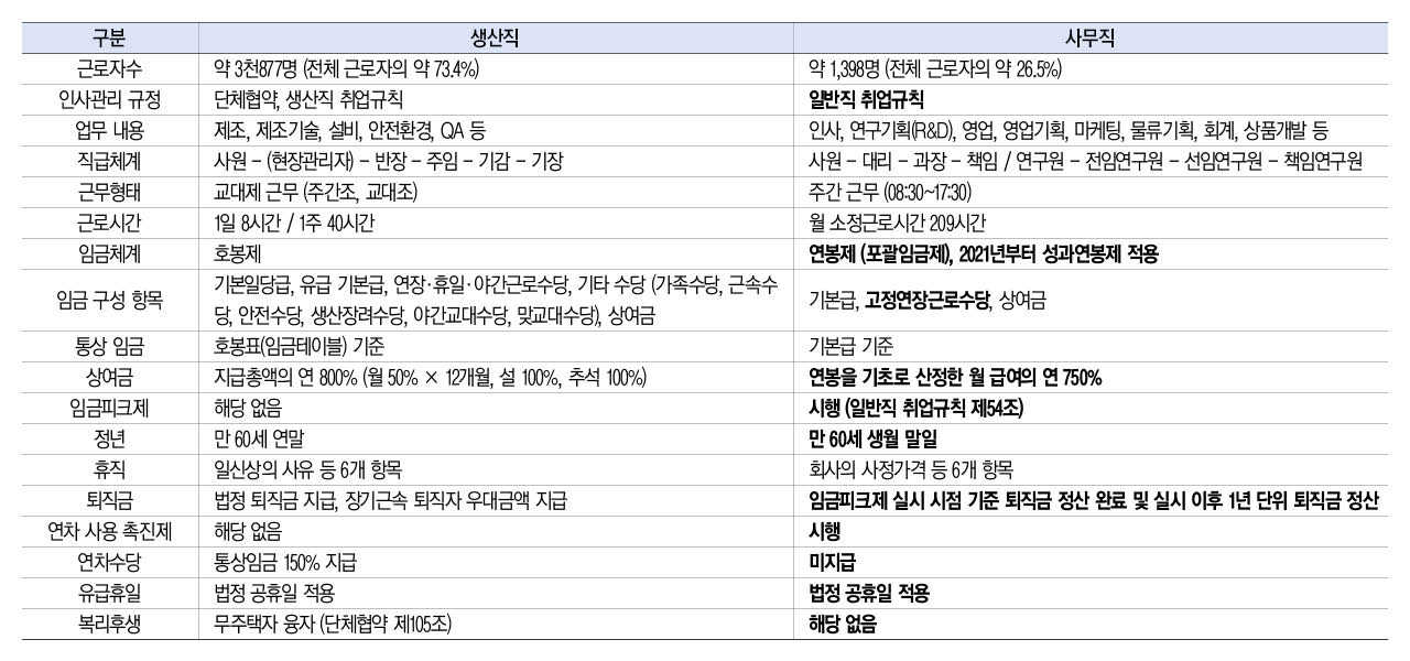 1) 현격한 근로조건의 차이 : 사무직과 생산직의 근로조건은 근로시간, 임금체계, 직급체계, 복리후생 등 여러 측면에서 큰 차이를 보인다. 사무직은 연봉제와 성과연봉제를 적용받으며, 임금피크제가 시행되고 있다. 반면 생산직은 호봉제를 적용받고, 연장·야간·휴일근로수당 등이 포함된 복잡한 임금체계를 가지고 있다. 다음 표에서 보는 것과 같이 판결이 인용한 현격한 근로조건 차이는 다양한 국면에서 발생했다(굵은 글씨는 특히 사무직군에 불리한 점이다).