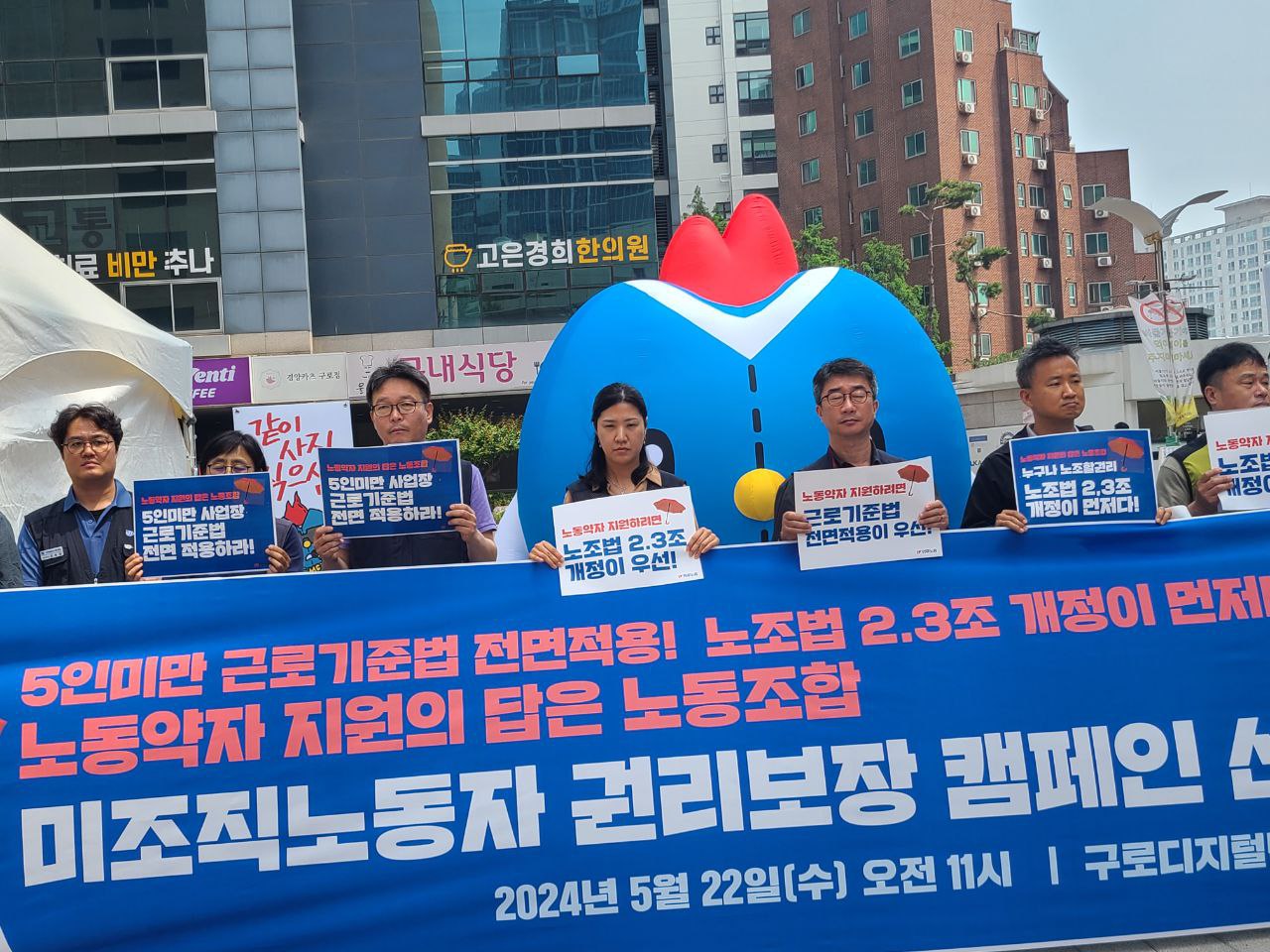 민주노총은 다음달 말까지 지역본부별로 각 지역 주요 거점에서 ‘5명 미만·작은사업장 노동자 권리보장 집중 캠페인’을 진행한다. 김태을 금속노조 서울지부장은 “정부는 공짜노동 부추기는 포괄임금제를 개선하고, 관리·감독 강화를 통해 산재예방에 나서고, 임금체불 사업주를 처벌하는 등의 역할을 하면 될 일”이라며 “작은사업장 노동자는 노조가 조직하겠다”고 밝혔다.