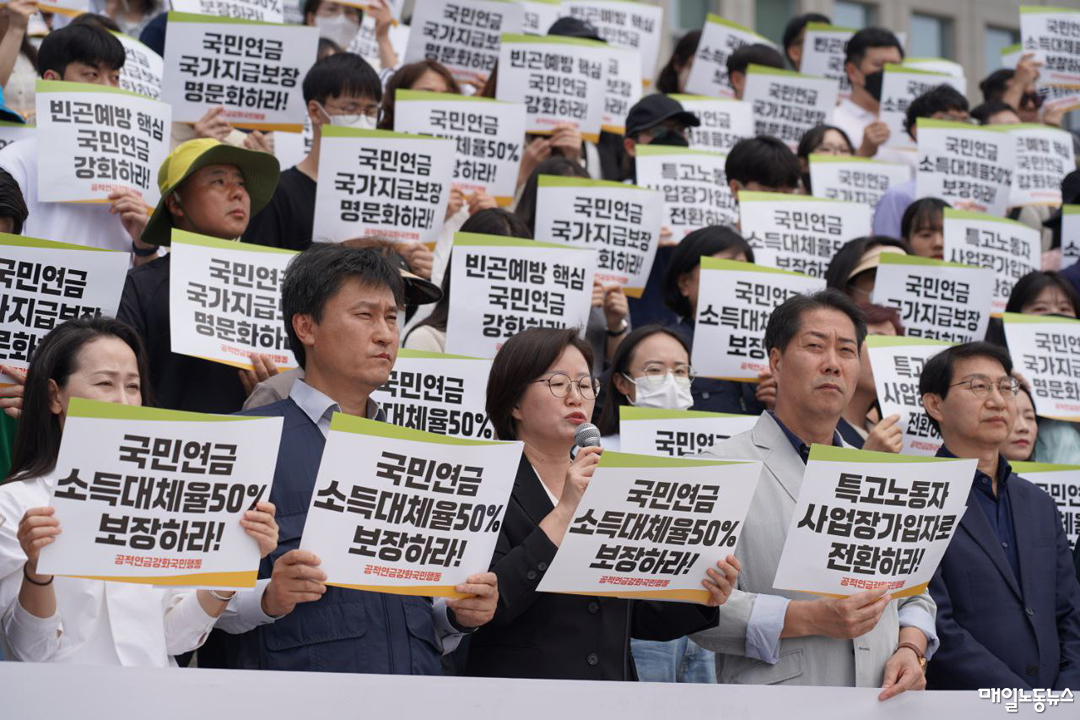 전호일 민주노총 부위원장은 “소득대체율을 향상하더라도 특수고용직과 플랫폼·프리랜서 노동자는 지역가입자로 분류돼 보험료 납부 부담에 따른 국민연금 사각지대에 있다”며 “이들을 사업장가입자로 전환해 사용자와 사업주 부담을 부과하는 입법을 촉구한다”고 말했다.