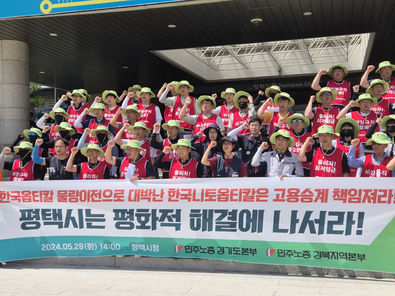 민주노총 경북지역본부와 경기지역본부는 28일 오후 경기도 평택시청 앞에서 기자회견을 열고 “한국옵티칼이 폐업한 뒤 니토옵티칼은 매출이 뛰어 신이 났다”며 “한국옵티칼에서 그 물량을 생산하던 노동자 11명 고용승계는 안 하겠다며 안면수심 태도로 돌변했다”고 말했다.