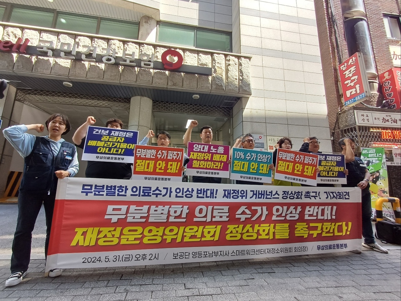양대 노총이 참여한 무상의료운동본부는 31일 오후 서울 영등포구 국민건강보험공단 영등포남부지사 스마트워크센터에서 기자회견을 열고 “대한의사협회는 이번 수가협상 선결 조건으로 10% 수가 인상을 주장했다”며 “의료현장을 떠나 환자에게 등을 돌린 의협은 무엇이 그리도 당당하냐”고 따졌다.