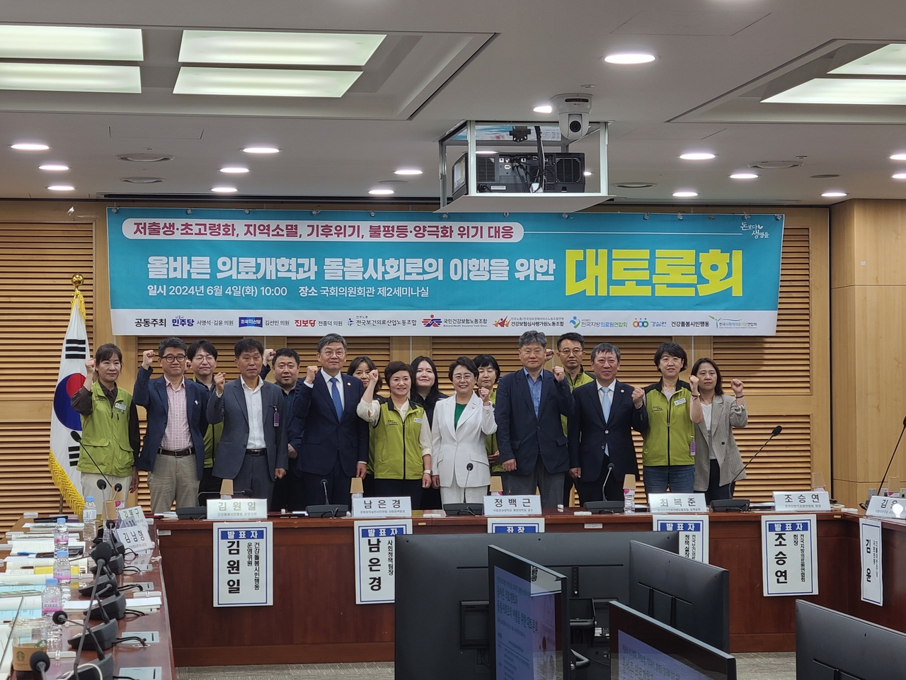 보건의료노조는 4일 오전 국회 의원회관에서 ‘올바른 의료개혁과 돌봄사회로의 이행을 위한 토론회’를 열었다. 토론회는 국민건강보험노조·건강보험심사평가원노조와 서영석·김윤 더불어민주당 의원, 김선민 조국혁신당 의원, 전종덕 진보당 의원 등이 공동주최했다.