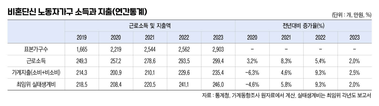 통계청 원자료를 분석해 본 결과 비혼단신 노동자가구의 2023년 근로소득은 299만4천원으로 전년의 293만5천원에 비해 2.0% 증가에 그친 것으로 나타난다. 실태생계비와 근로소득 증가율이 동일한 수준이다. 근로소득 증가율은 2021년 8.3%, 2022년 5.4%에 이어 증가폭이 계속 줄어들고 있다. 이에 따라 가계총지출은 2020년 코로나19 당시 –6.3%를 기록했다가 2021년에는 4.6% 증가로 회복한 뒤 2022년에는 9.3% 늘어났으나 2023년에는 2.5% 증가에 그쳤다. 최저임금위의 실태생계비는 2020년 –4.6%, 2021년 5.8%, 2022년 9.3%, 2023년 2.0% 상승한 것으로 보고됐다.
