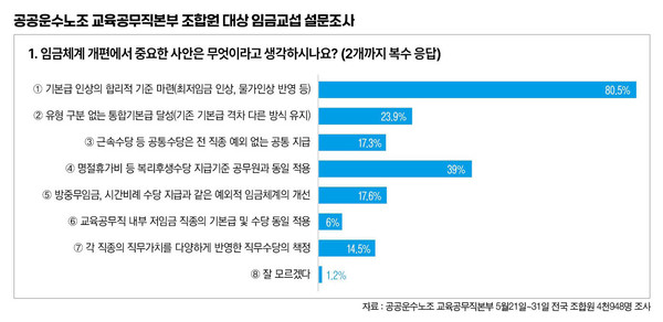 교육공무직본부가 지난달 21~31일 조합원 4천948명을 대상으로 설문조사한 결과 40.6%의 조합원이 “2~3일의 파업이 적절하다”는 답을 골랐다. 무기한 파업을 택한 이도 27%나 됐다. 임금항목 중 역점을 기울여 투쟁해야 하는 사안(복수응답)에는 기본급 인상(84.9%)과 근속수당 인상(48.7%)을 가장 많이 선택했다. 임금체계 개편에서 중요한 사안을 묻는 항목에는 “기본급 인상의 합리적인 기준을 마련하라”는 주문이 80.5%나 됐다.
