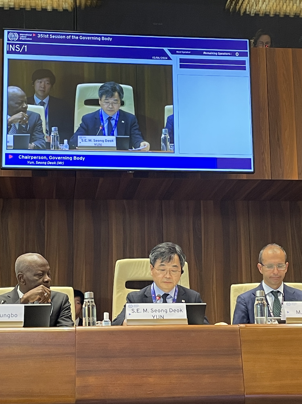 16일 고용노동부에 따르면 스위스 현지 시각으로 지난 15일 오전 열린 351차 ILO 이사회에서 윤 대사가 1년 임기의 이사회 의장직에 올랐다.