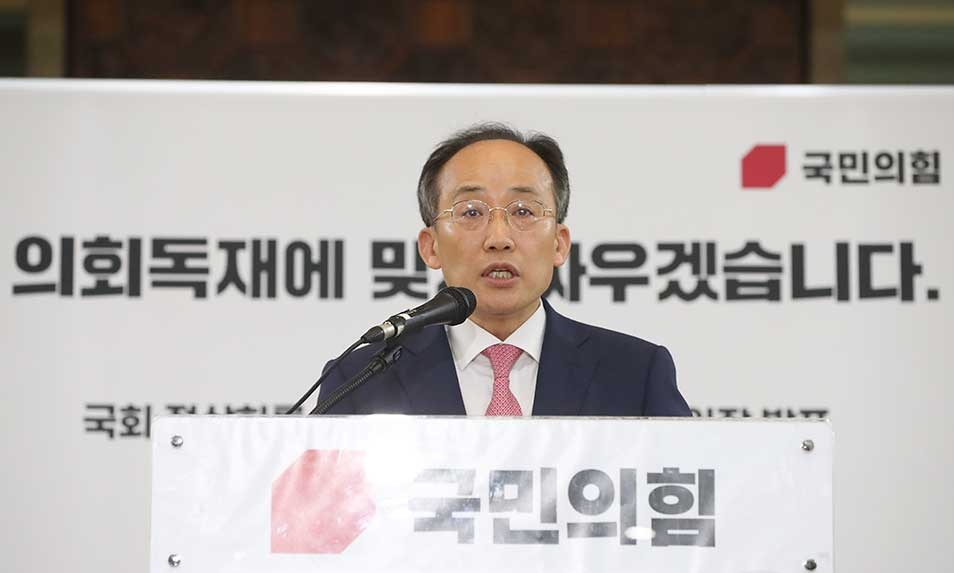 추경호 국민의힘 원내대표는 24일 오전 국회 본청에서 열린 의원총회 직후 기자들과 만나 “11개 상임위가 무소불위로 민주당 입맛대로 운영되는 것처럼 나머지 7개 상임위 역시 정쟁에 이용될 게 불 보듯 뻔하다”며 “국민의힘은 민주당의 폭주를 막기 위해 국회 등원을 결심했다”고 말했다.