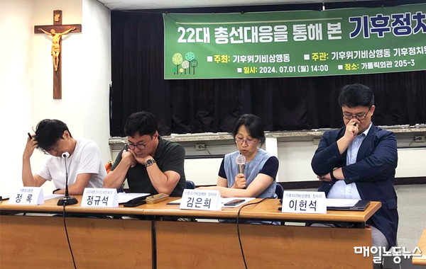 이런 고민은 22대 총선 과정에서 여러 정당이 기후공약을 제시하고도 개원 후 한 달여간 기후문제가 의제화하지 않는 현상을 반추한 결과다. 유권자가 기후에 관심이 없었던 것도 아니다. 기후위기비상행동이 22대 총선에 앞서 실시한 시민 1만7천명 설문조사에서 33.5%가 기후문제를 총선에서 가장 중요한 의제로 인식하는 이른바 ‘기후유권자’라는 결과도 있다. 게다가 총선에 출마한 모든 정당이 기후와 환경 의제를 공약으로 제시하기도 했다. 그러나 실제 선거에서 기후문제는 공론화되지 못했고 개원 이후에도 뒷전이다. 이 기후정치위원은 “이번 총선은 사상 처음으로 기후위기를 중심으로 작은 마당이 벌어졌으나 사전에 충분히 준비하지 못한 기후정의진영과 진보정당이 철저히 패배한 선거”라며 “기후정의운동 진영이나 기후정치마당을 만든 이가 정치공간을 활용하지 못했다”고 진단했다.