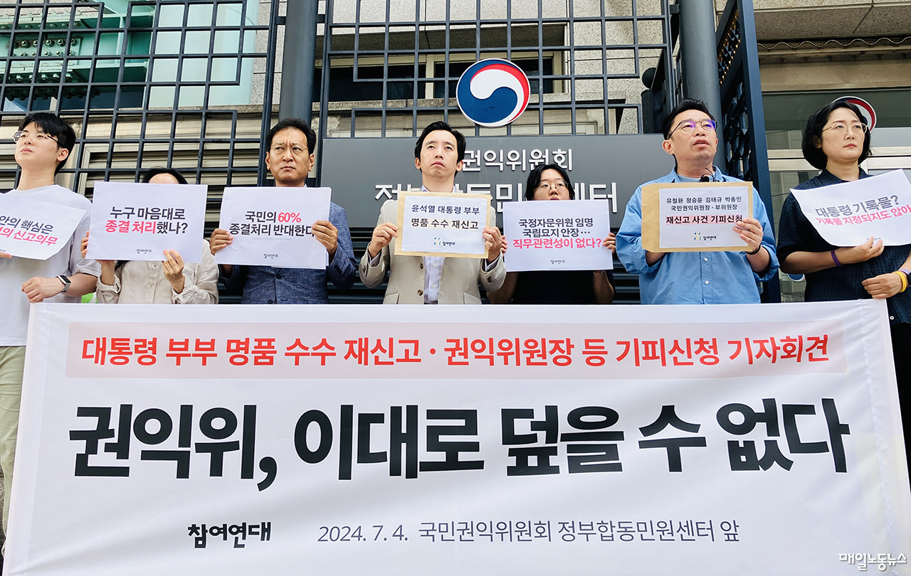 참여연대는 이날 오전 서울 종로구 권익위 정부합동민원센터 앞 기자회견을 통해 “지난해 김건희 여사가 명품 가방을 받는 영상이 공개된 이후 금품 제공자인 최재영 목사는 ‘김 여사에게 건넨 금품들이 더 있고 구체적 청탁이 실행되기도 했다’고 주장하고 있다”며 지적했다.