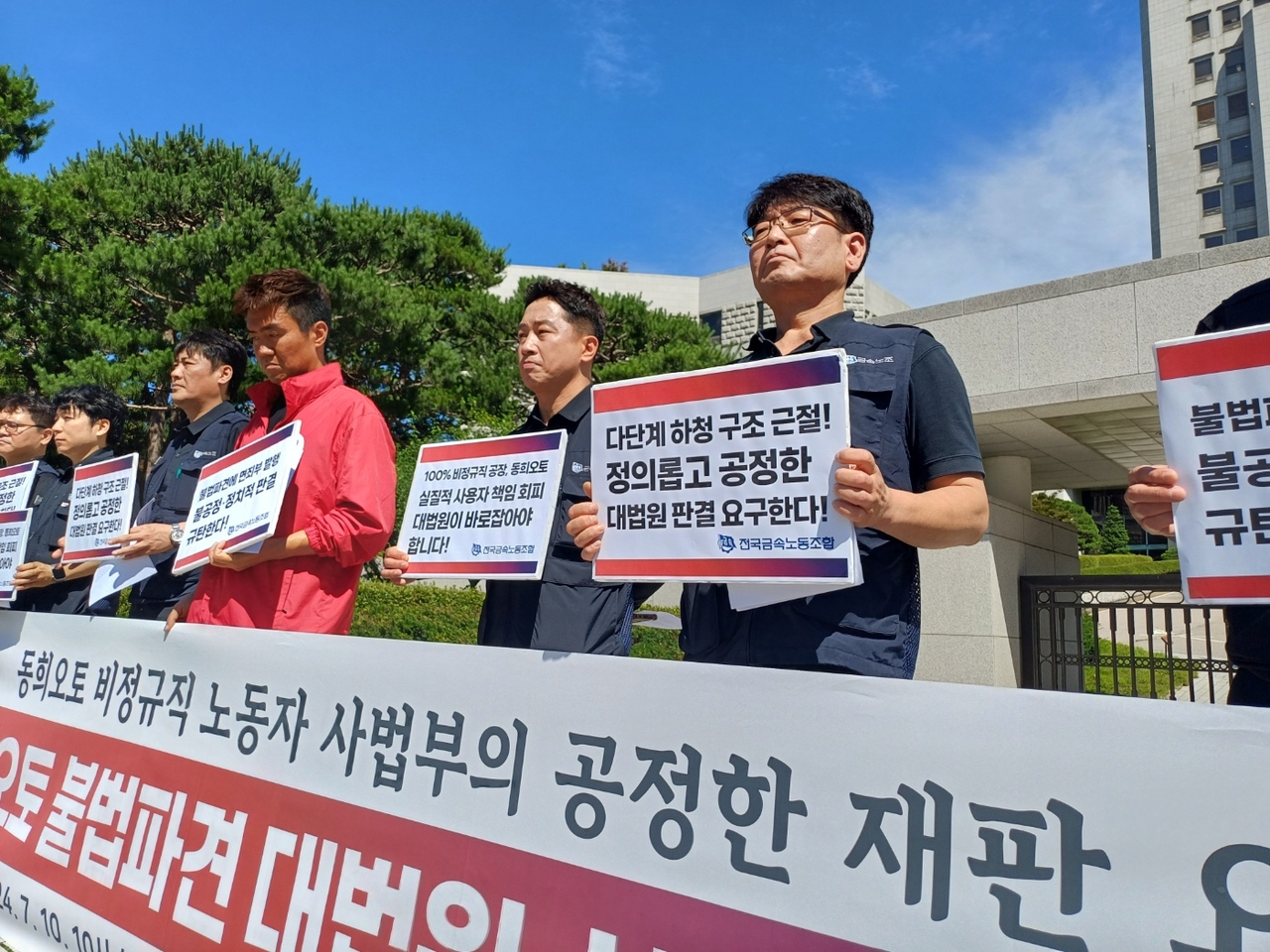 심인호 금속노조 기아자동차지부 동희오토지회장은 “1·2심 판결은 그간의 대법원 판례에 반할 뿐 아니라 우리가 제출한 증거도 제대로 살피지 않았고 결과적으로 재계가 주장한 논지와 주장으로 점철됐다”며 “6월17일 현대모비스에 대한 유사한 최신 판례조차 검토하지 않은 불성실하고 불공정한 판결”이라고 규탄했다.