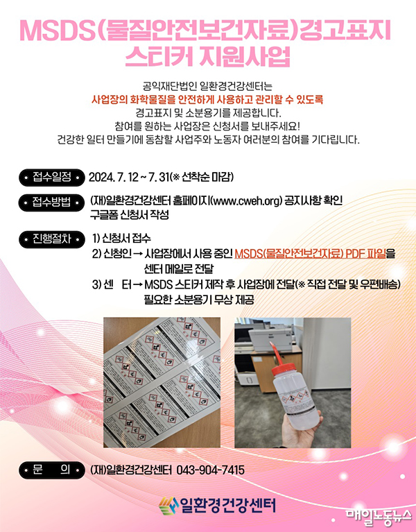 모든 일에는 순서가 있다. 물인 줄 알고 독극물을 들이켜는 노동자가 생기지 않도록 하는 일에서 시작해야 한다. 센터는 현재 MSDS 스티커 사업에 참여할 사업장을 모집 중이다. 참여를 원하는 기업은 센터 홈페이지(cweh.org)에서 공지사항을 확인한 뒤 이달 31일까지 구글폼(forms.gle/BMnXRo2opEcybyfV8)으로 신청하면 된다. 문의 043-904-7415.