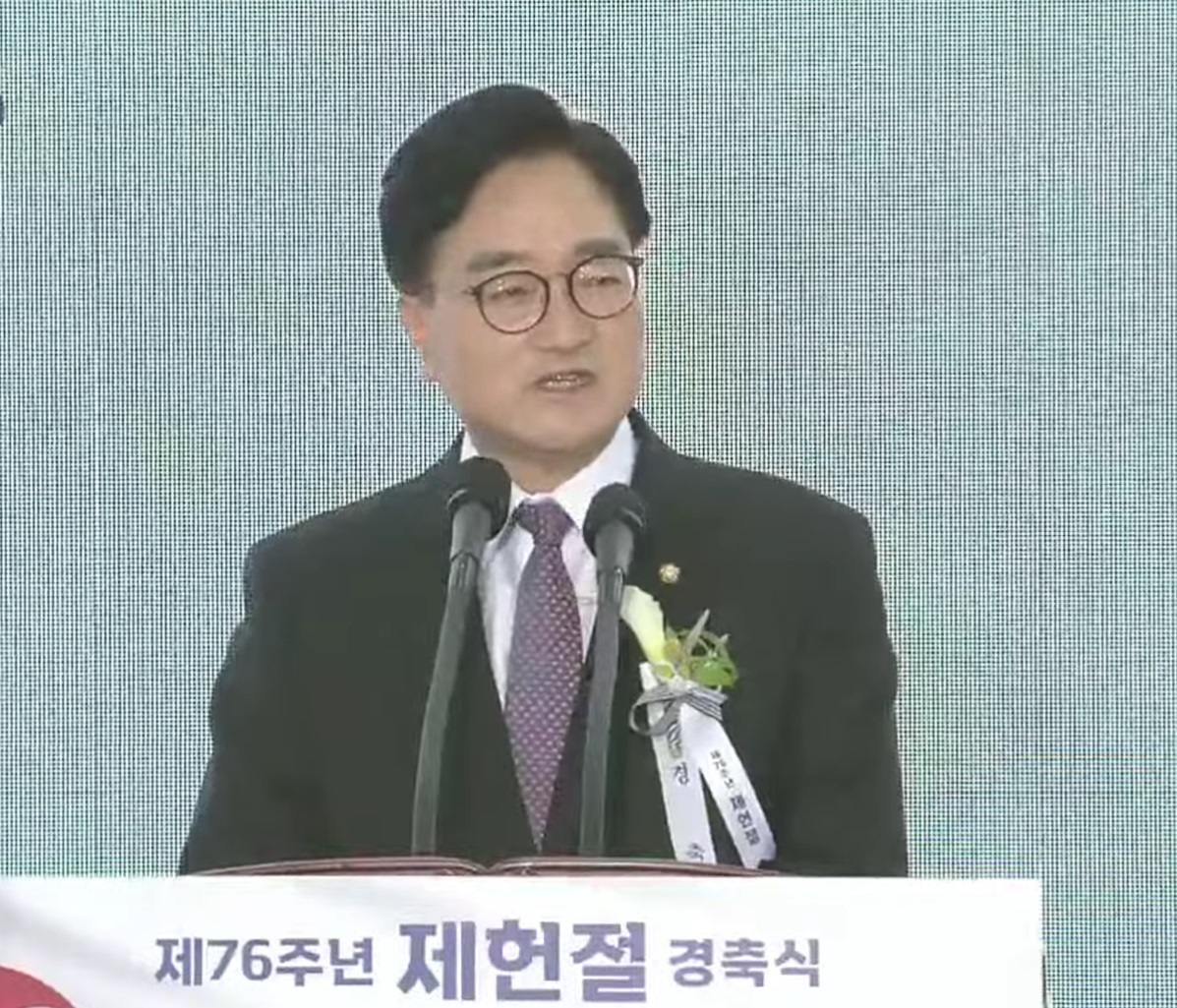 거대 여야의 갈등으로 개원식을 하지 못한 현 상황을 언급하기도 했다. 우 의장은 “제헌절을 맞도록 국회 개원식도 열지 못하고 있다”며 “국민의 질책을 달게 받겠다”고 했다. 그는 “국민을 지키는 국회, 미래로 나아가는 국회를 만들기 위해 새로워지겠다”고 약속했다.