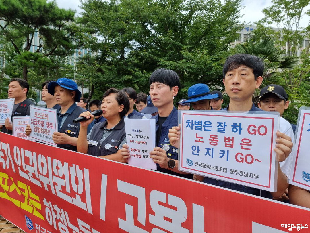 금속노조 광주전남지부와 포스코사내하청광양지회는 이날 오후 광주지법 순천지원 앞에서 기자회견을 열고 “포스코가 자녀학자금 지급을 배제한 것은 근로자지위확인 소송과 금속노조 가입을 막기 위한 것”이라며 “실제로 2천명이 넘었던 소송 참가자 중 500여명이 소송을 철회하고 금속노조를 탈퇴했다”고 밝혔다. 이어 “잇따른 법원 판결로 위법이 명백해진 만큼 포스코와 근로복지기금은 학자금과 복지포인트를 즉각 지급해야 한다”며 “포스코가 법원의 잇따른 위법 판결에도 12%의 법정이자를 감수하면서까지 자녀학자금 지급을 이행하지 않는다면 학자금 배제가 ‘노조탄압’용이라고 자인하는 것”이라고 지적했다.