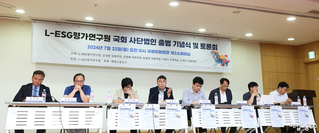 노동관점으로 환경·사회·지배구조(ESG) 개선 방향을 연구·평가하는 L-ESG평가연구원(이사장 송경용)이 국회사무처 사단법인 등록에 따른 본격적인 활동에 나섰다. 연구원은 22일 오전 국회 의원회관에서 사단법인 출범기념식과 국회토론회를 개최했다. 김성환·김영배·민병덕·이해식·손명수 더불어민주당 의원이 공동주최하고, <매일노동뉴스>가 후원했다.