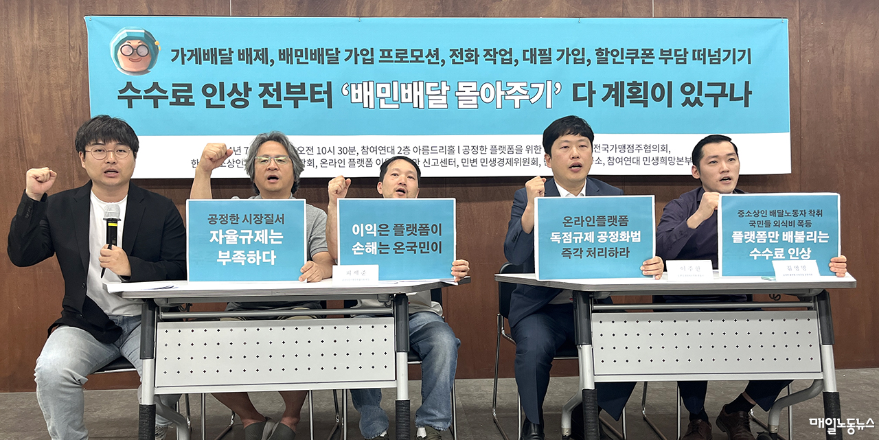 배달 플랫폼 점유율 1위 배달의민족이 수수료를 늘리려고 시장지배적 지위를 남용해 입점업체에 경영 간섭을 했다는 비판이 거세다. 자영업자·시민단체들은 23일 오전 참여연대 2층 아름드리홀에서 기자회견을 열고 배달의민족을 운영하는 우아한형제들을 공정거래법 위반 혐의로 신고하겠다고 밝혔다. 이들은 우아한형제들이 ‘배민배달’과 ‘배민1플러스 서비스’ 등으로 수수료 부과 방식을 변경시키기 위해 공정거래법이 금지하는 △시장지배적 지위 남용 △거래상 지위 남용 △경영간섭 등을 했다고 봤다. 기자회견에는 ‘공정한 플랫폼을 위한 사장님 모임’과 한국중소상인자영업자총연합회, 민변 민생경제위원회, 민생경제연구소, 참여연대 민생희망본부 등이 참석했다.