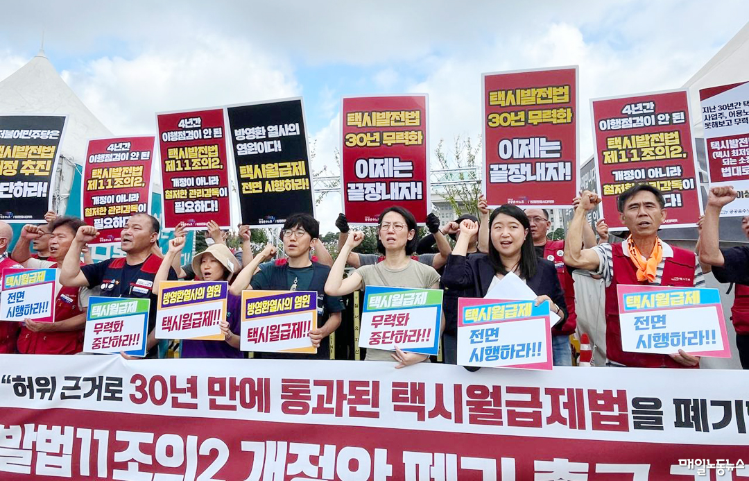 이삼형 공공운수노조 택시지부 정책위원장은 “5년 전 민주당 의원들의 주도로 택시월급제 법안이 통과됐는데 이제 와서 택시월급제를 무력화하는 법안이 심사되고 있다”며 “코로나19 시기 매출을 기준으로 사업주들이 월급제 도입이 어렵다고 하는데 대단히 잘못된 주장”이라고 비판했다.