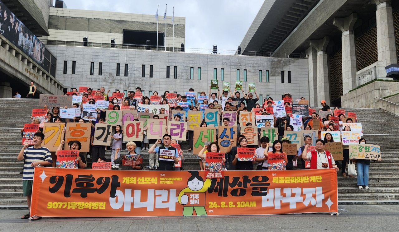 양대 노총·여성농민회·탈핵시민행동 400여개 노동·시민·사회단체가 8일 오전 ‘907 기후정의행진 선포식’을 열고 다음달 7일 서울시 강남구 일대에서 “기후위기 당사자들과 힘찬 행진을 만들 것”이라고 알렸다. 907기후정의행진 조직위는 행진에 3만여명이 참여할 것으로 내다보고 있다.