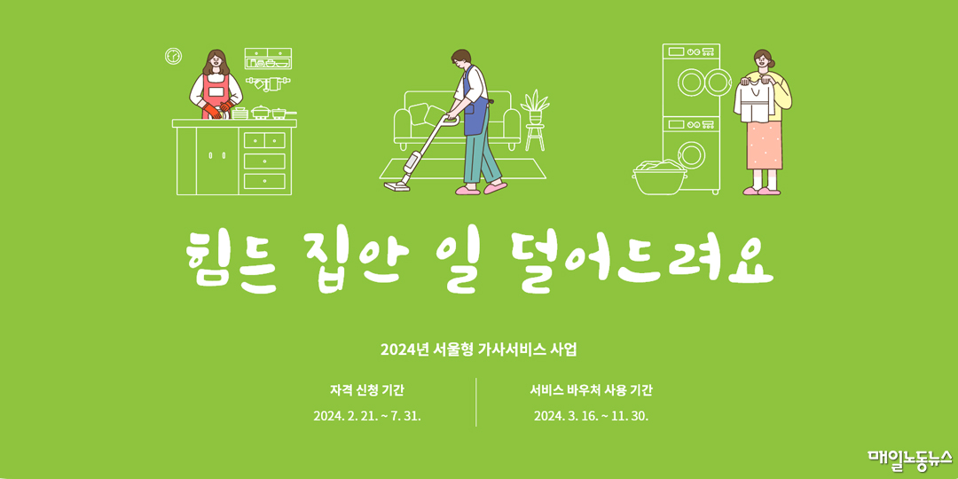 서울형 가사서비스는 중위소득 150% 이하 임산부·맞벌이·다자녀 가정에 가사부담을 덜기 위해 가사서비스를 제공하는 사업이다. 가구당 가사서비스 10회가 제공되는데, 가사인증기관(위탁업체)이 고용한 가사노동자가 가정에 방문해 가사서비스를 제공하는 형식이다. 서울시는 올해 1만가구에 이 서비스를 제공한다. 사업 규모가 전년도(6천 가구)보다 67% 확대됐다.