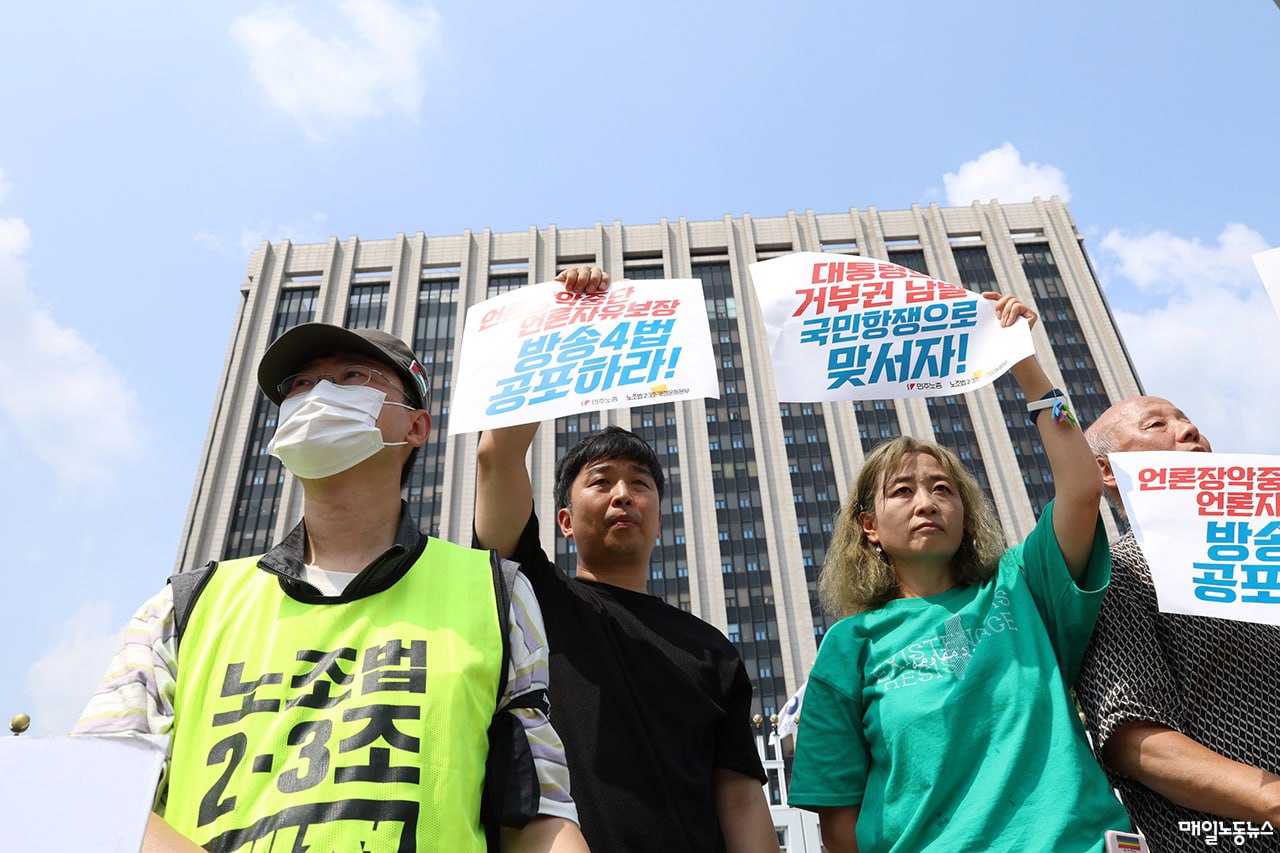 한편 윤석열 대통령이 전날 방송법·방송문화진흥회법·한국교육방송공사법·방송통신위원회의 설치 및 운영에 관한 법률(방송통신위원회법) 개정안인 ‘방송 4법’에 19번째 거부권을 행사한 것을 두고도 반발이 이어지고 있다. 언론장악저지공동행동은 13일 오전 용산 대통령실 앞에서 기자회견을 진행하고 “언론과 방송 독립, 민주주의 수호를 염원하는 각계 시민사회단체, 무수한 시민들과 윤석열 정권 심판 투쟁에 나설 것”이라고 경고했다.