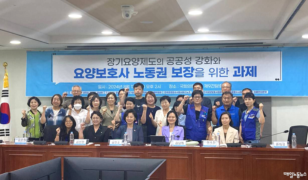 공공운수노조 의료연대본부는 전국요양보호사협회와 13일 오후 국회 의원회관에서 ‘장기요양제도의 공공성 강화와 요양보호사 노동권 보장을 위한 과제’ 토론회를 열었다. <<토론회는 남인순·백혜련·김남희 더불어민주당 의원과 김선민 조국혁신당 의원, 노인장기요양 공공성 강화 공동대책위원회 등이 공동 주최했다.>>