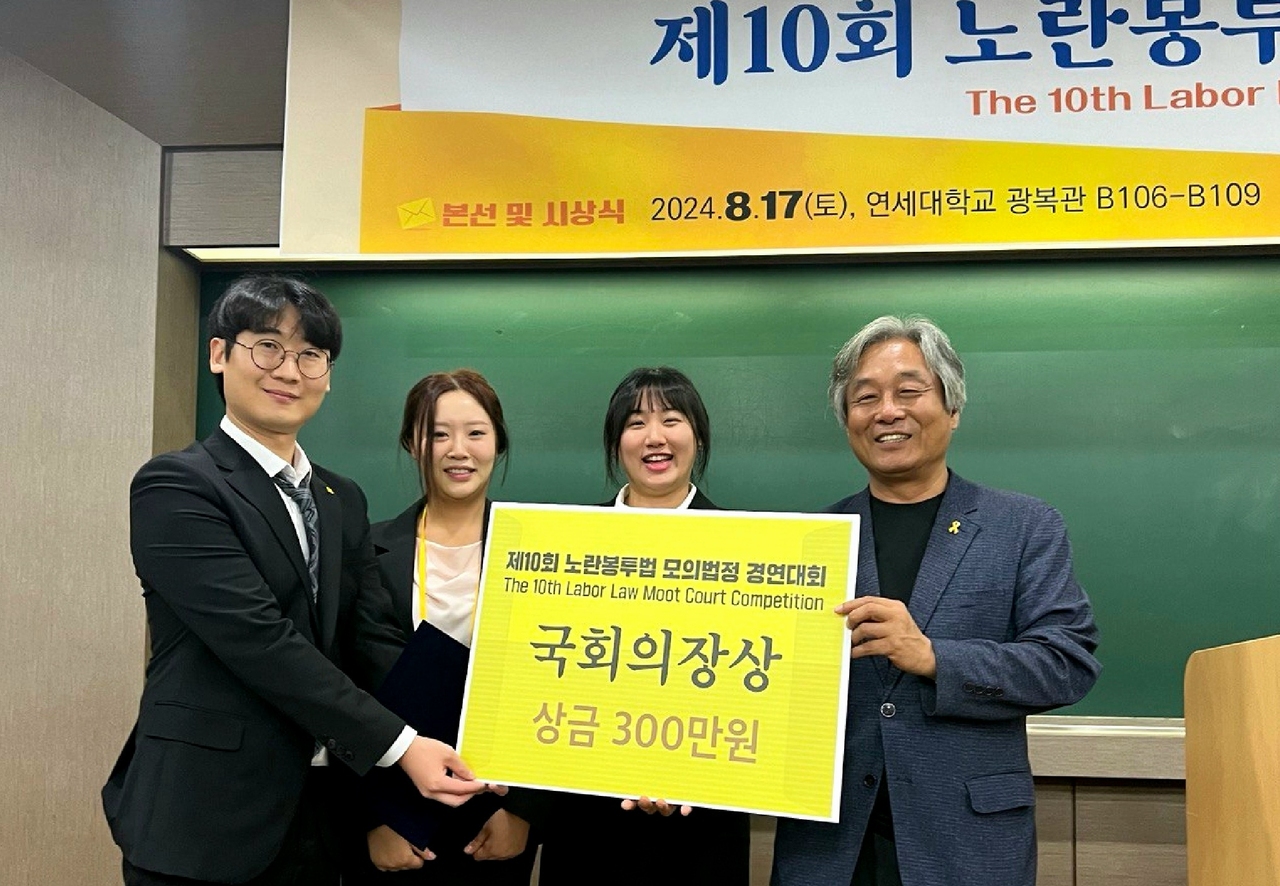 시민단체 ‘손잡고(손배가압류를 잡자! 손에 손을 잡고)’가 민주노총·한국노총·연세대 공익법률지원센터와 공동주최로 지난 17일 연세대 광복관에서 진행한 10회 노란봉투법 모의법정 경연대회에서 충북대가 최우수상인 국회의장상을 수상했다. 우수상인 국가인권위원장상은 한양대가 장려상인 민주노총법률원장상과 한국노총법률원장상은 한양대와 성균관대·연세대에 돌아갔다.