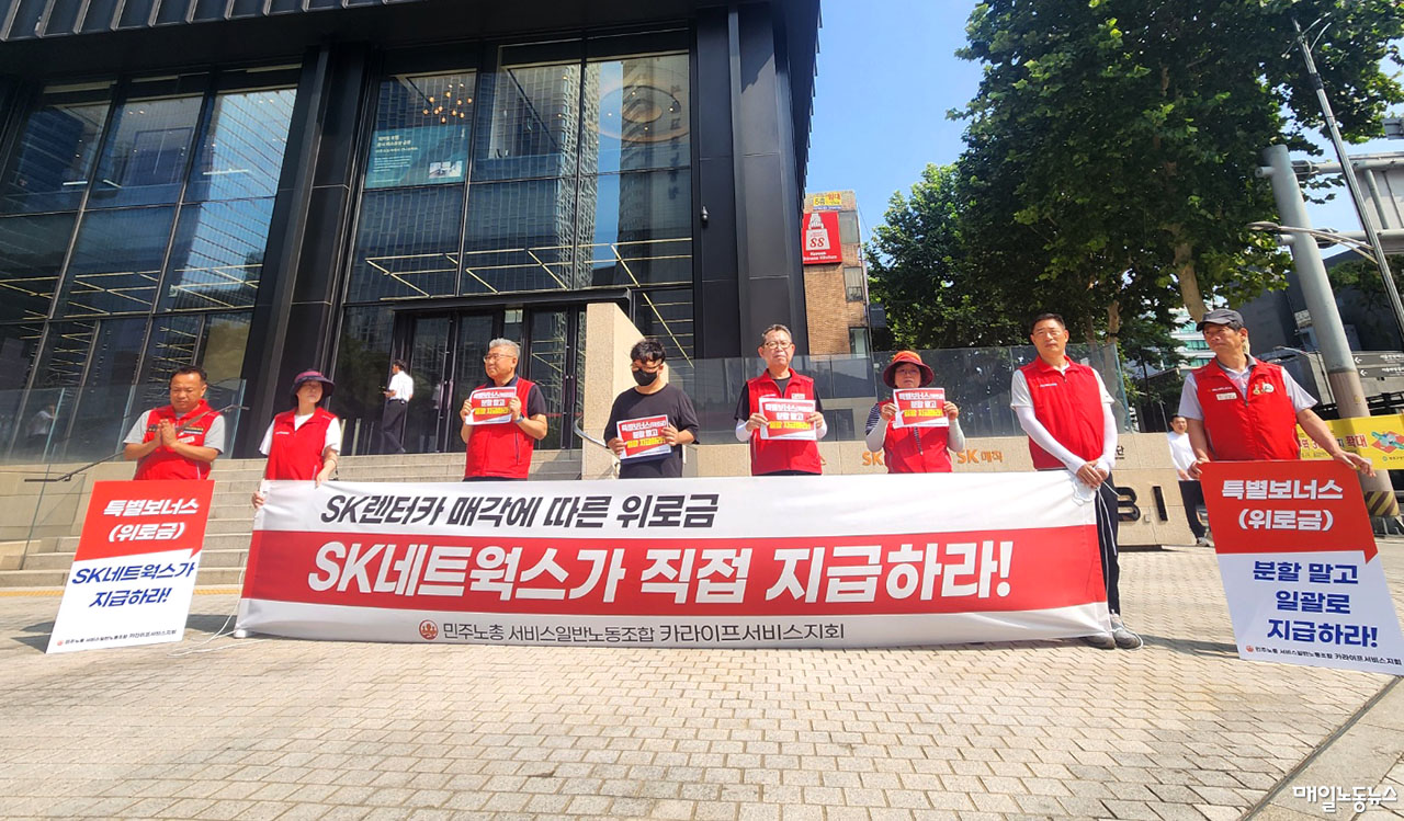 사모펀드에 매각된 SK렌터카의 자회사 노동자들이 SK네트웍스에 매각 위로금 직접 지급을 요구했다.