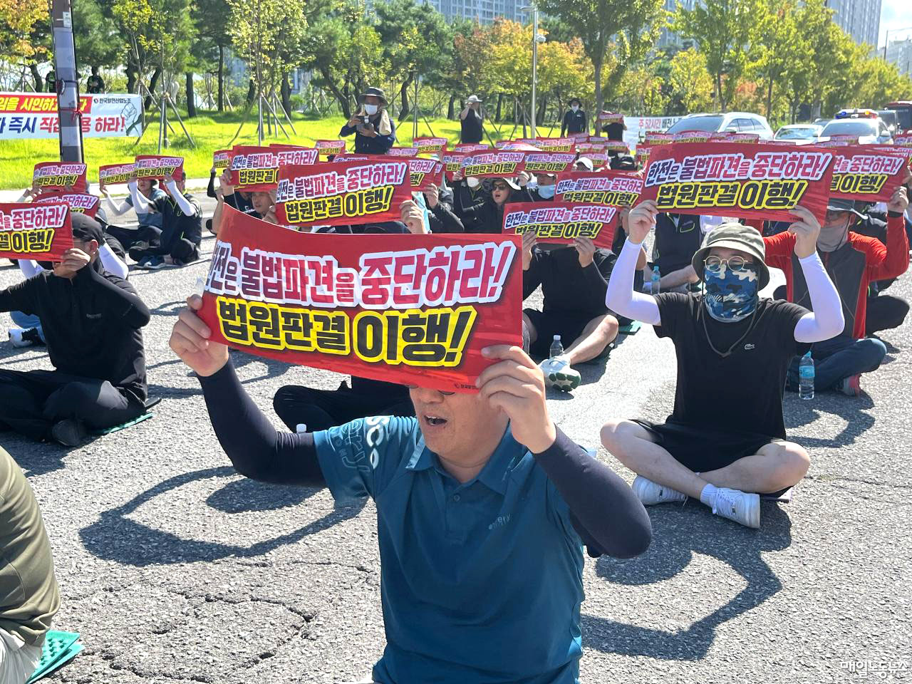 후문을 둘러싸고 한참 동안 서서 “고용안정 쟁취”를 외치던 하청노동자들이 결의대회를 진행하기 위해 아스팔트 바닥에 앉았다.