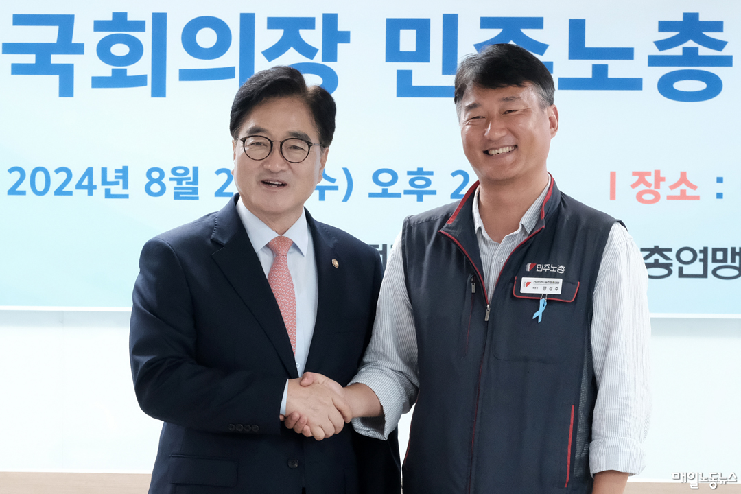 우 의장은 국회 사회적 대화의 장점을 강조했다. 그는 “국회에서 사회적 대화를 하면 다양한 주제를 다양한 방식으로 다룰 수 있다”며 “국회는 생각이 다른 여야가 있지만 사회의 다양한 세력이 함께 논의하는 구조를 만드는 것도 과제”라고 말했다. 국회 사회적 대화의 구상도 일부 드러냈다. 우 의장은 “노사, 노사정, 노정 등 다자간 대화뿐 아니라 의제별 테이블에 다양한 국회 상임위원회가 참여해 논의한다면 명실상부한 사회적 대화 허브가 될 것”이라며 “사회적 대화를 통해 갈등을 풀고 미래를 대비하는데 민주노총 역시 같은 생각일 것”이라고 밝혔다. 민주노총도 공감을 표했다. 양경수 위원장은 “민주노총이 사회적 대화를 일방적으로 거부하는 것은 아니다”며 “대화의 조건과 경로를 잘 만들어 신뢰를 형성하는 게 중요하다”고 화답했다. 이어 “작은 영역부터 얽힌 갈등을 풀어가는 정형을 만들고 이를 토대로 신뢰를 형성하면 장기적으로 지속적인 대화가 가능하다”고 덧붙였다. 국회의 적극적인 역할을 주문했다. 그는 “국회를 통과한 법안을 반복적으로 거부하는 윤석열 대통령은 입법부를 무력화하고 삼권분립을 부정하는 초헌법적 행위를 하고 있다”며 “총선 민심을 반영해 노동자와 서민의 삶을 개선할 수 있도록 국회의 권한을 총동원해 단호한 대응을 당부드린다”고 말했다.