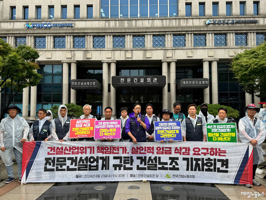 건설노조 토목건축분과위원회는 21일 오전 서울 동작구 전문건설회관 앞에서 기자회견을 열고 “전문건설업계의 요구대로 임금을 삭감하면 그나마 있던 청년들은 안 그래도 불안한 고용 속에서 미련 없이 건설현장을 떠날 것”이라고 말했다.