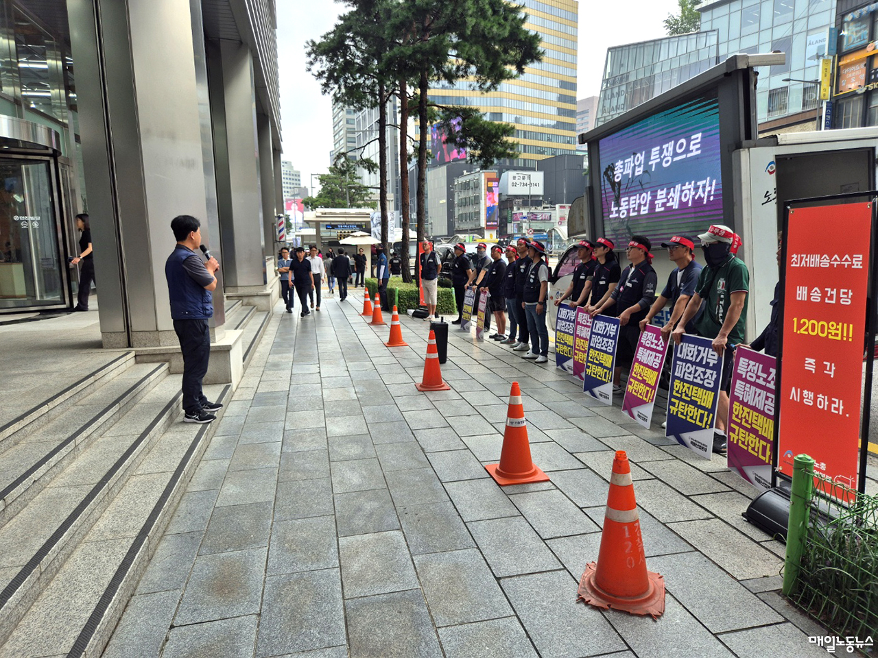 한국노총전국연대노조 택배산업본부(본부장 김사성)는 27일 서울 중구 한진택배 본사 앞에서 결의대회를 열고 “한진택배는 최저배송수수료 제도를 즉각 시행하라”고 촉구했다.