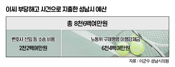 해고 대상자인 이아무개씨는 성남시 직장운동부 소속 테니스팀에서 15년 가까이 일했다. 2005년 12월부터 2010년 12월까진 코치를, 2013년 9월부터 감독을 맡았다. 기간제 노동자인 탓에 1년 단위로 근로계약을 체결해야 했다.