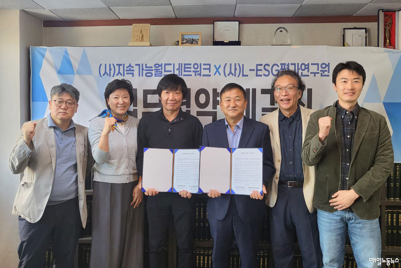 ㈔L-ESG평가연구원(이사장 송경용)과 ㈔지속가능월드네트워크(이사장 최수일)가 지난달 30일 오전 서울 마포구 <매일노동뉴스>에서 L-ESG(노동중심 환경·사회·지배구조)에 대한 사회적 인식 제고와 확산을 위해 협력하고, 탄소중립활동 등 지구살리기 공동캠페인을 함께 진행하는 내용의 양해각서(MOU)를 체결했다.