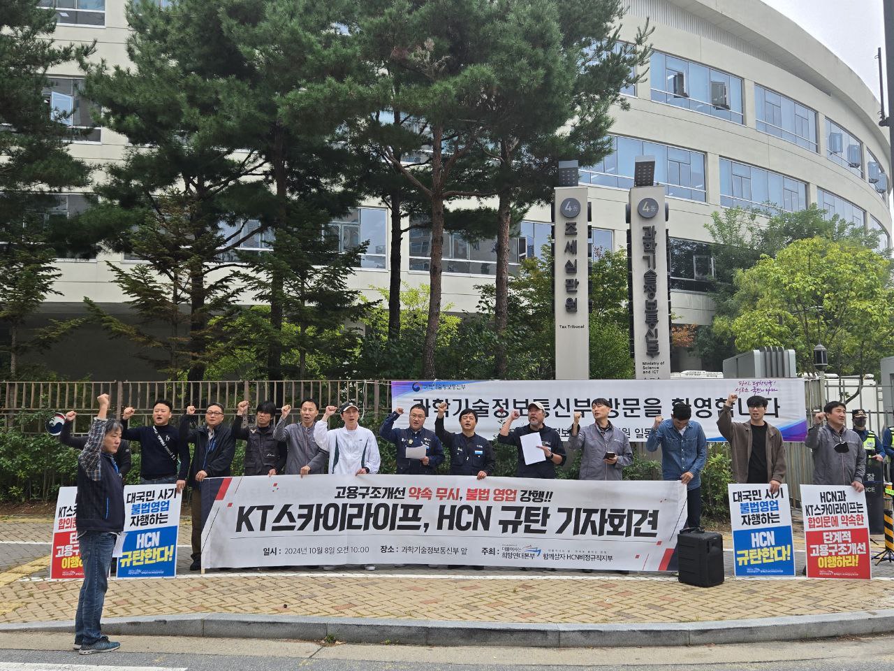 공공운수노조 희망연대본부 함께살자HCN비정규직지부(지부장 강지남)는 8일 오전 정부세종청사 과학기술정보통신부 앞에서 기자회견을 열고 “HCN은 대국민사기 불법영업을 중단하라”고 촉구했다. HCN은 자사 케이블방송·설치·수리노동자를 협력업체를 통해 고용하고 있다.
