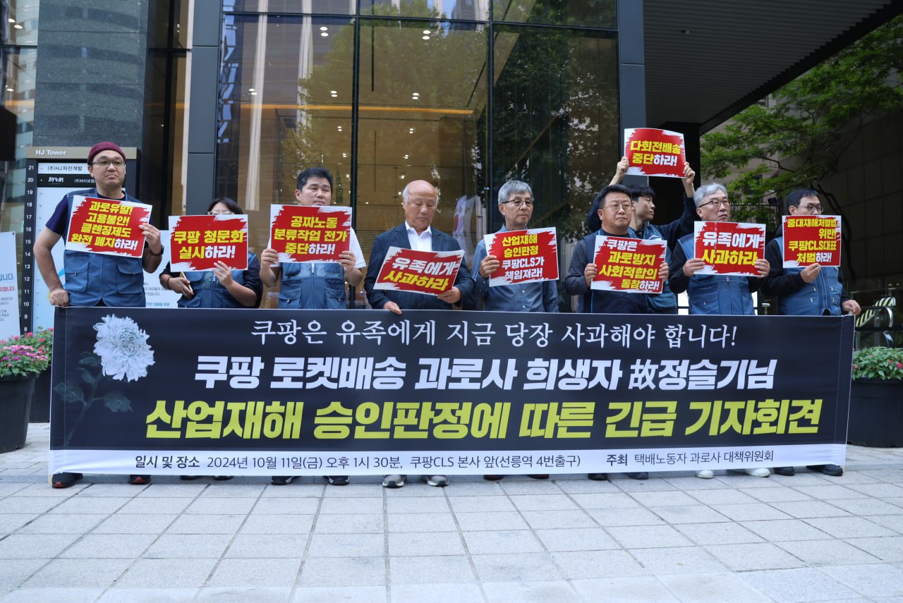 택배노동자과로사대책위와 고인의 아버지인 정금석씨는 11일 오후 서울 강남구 쿠팡로지스틱스서비스(CLS) 본사 앞에서 기자회견을 열고 “고인의 노동조건은 쿠팡 새벽배송 택배노동자 대다수의 노동조건이며, 쿠팡이 책임져야 한다”고 주장했다.