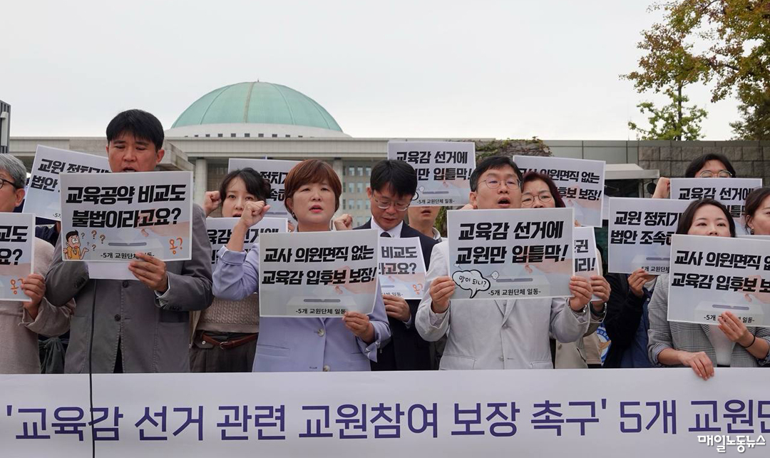 이와 관련해 교원단체 연합회는 14일 오전 국회 앞에서 기자회견을 열고 “교육감 선거 과정에 현장의 교육전문가인 교원 참여를 보장하라”고 촉구했다. 연합회에는 전교조·교사노조연맹·새로운학교네트워크·실천교육교사모임·좋은교사운동이 함께한다.