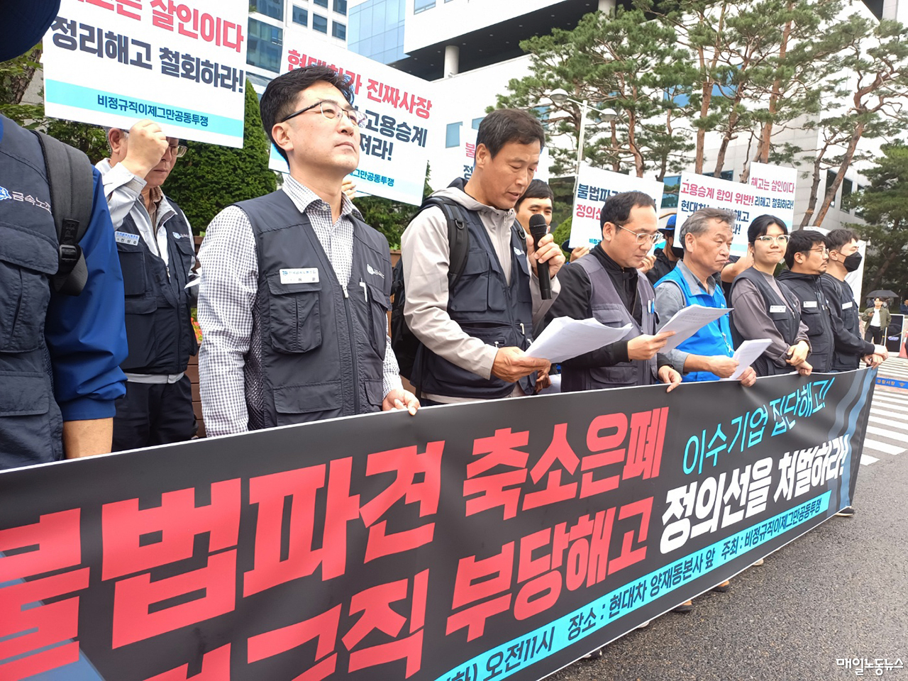 이수기업에서 일한 강호덕씨는 “10년 이상 현대차에서 비정규직으로 일하며 하청업체를 통해 고용을 승계했는데 원청이 공정 정규직 전환을 이유로 비정규 노동자를 일방적으로 해고하고 공장 밖으로 쫓아낸 것에 분노를 금할 수 없다”며 “우리 비정규직은 현대차 지속성장을 위해 헌신해 정당한 고용승계와 고용안정을 요구할 자격이 있으나 원청은 이런 기여를 배신했다”고 분개했다.