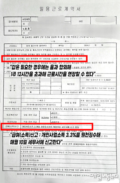 23일 <매일노동뉴스>가 입수한 올리브영 물류센터 A인력도급업체의 일용 근로계약서를 보면 “개인사업소득 3.3%를 원천징수해 매월 10일 세무서에 신고한다”고 적혀있다. 일용직 노동자를 고용·산재보험에 가입시키는 대신 개인사업소득세 3.3%를 떼겠다는 의미다. 근로기준법상 노동자를 개인사업자로 둔갑시키는 대표 수법 중 하나다. 일용직 노동자는 고용·산재보험 적용 대상으로 단 하루만 근무해도 사업주는 근로복지공단에 일용근로 확인 신고서를 제출해야 한다.