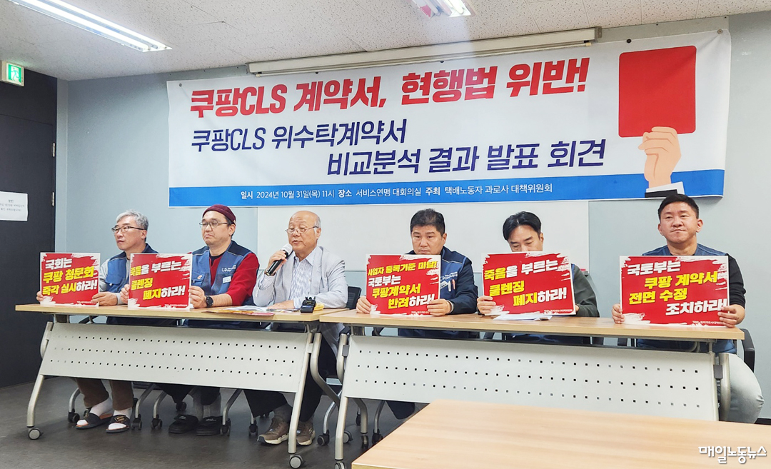 택배노동자과로사대책위는 31일 오전 서울 서대문구 서비스연맹에서 기자회견을 열고 “2021년 당시 CLS가 제출한 위수탁계약서 중 무려 14개 조항이 표준계약서와 다르게 작성돼 있었다”며 “CLS의 위수탁계약서는 표준계약서에 기초한 계약서가 아니며, 이를 근거로 택배사업자 등록증을 교부하는 것은 위법한 법 집행”이라고 지적했다.