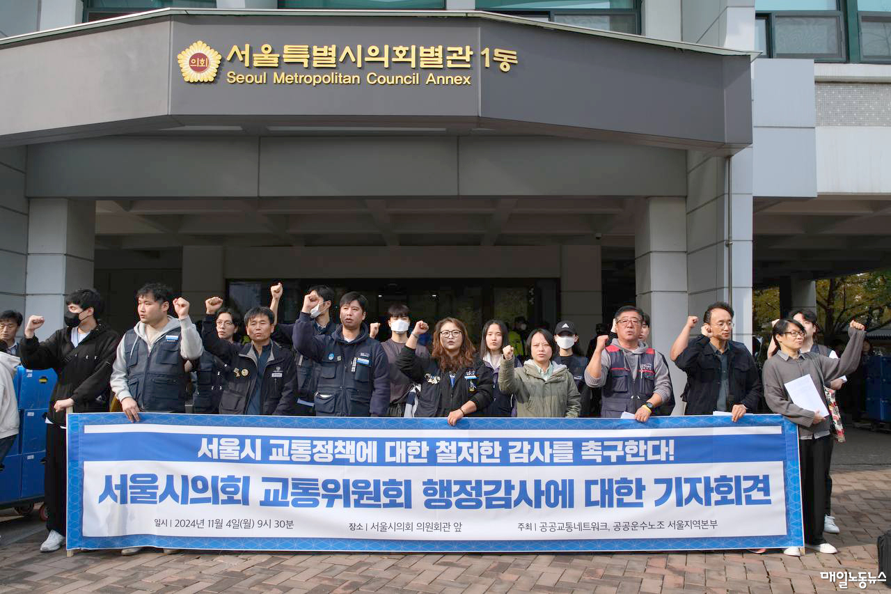 공공운수노조 서울지역본부(본부장 이현미)와 공공교통네트워크는 4일 오전 서울시의회 의원회관 앞에서 기자회견을 열었다. 서울시의회는 이날부터 17일까지 서울시의 행정사무를 살펴보는 행정사무감사를 실시한다. 서울시의회 교통위원회는 서울시 교통실을 비롯해 서울교통공사·도시기반시설본부(도시철도국)·서울시설공단을 감사한다.