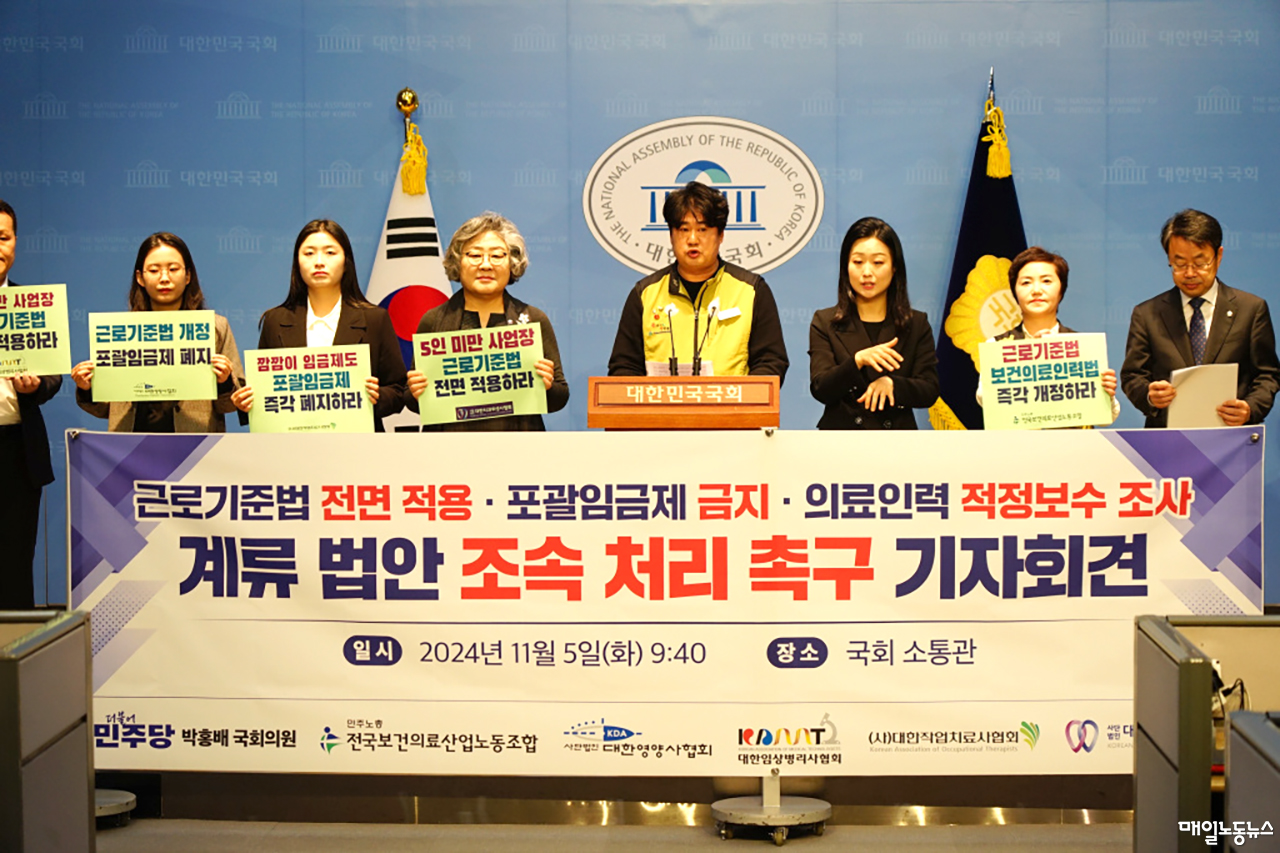 보건의료노조(위원장 최희선)와 박홍배 더불어민주당 의원은 5일 오전 국회 소통관에서 기자회견을 열고 사업장 규모와 관계없이 모든 노동자에게 근로기준법을 보장하고 보건의료인력지원법을 개정해야 한다고 촉구했다. 이날 기자회견은 의료전문직종협회인 대한영양사협회·대한임상병리사협회·대한작업치료사협회·대한치과위생사협회가 공동 주최했다.