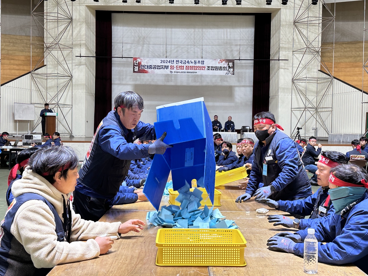 금속노조 현대중공업지부는 8일 오전 7시부터 정오까지 잠정합의안에 대한 찬반투표를 진행한 결과 전체 조합원 6천648명 중 6천130명(92.2%)이 투표해 2천419명(39.5%)이 찬성하고 3천658명(59.7%)이 반대해 부결됐다고 밝혔다. 무효표는 53명이었다.