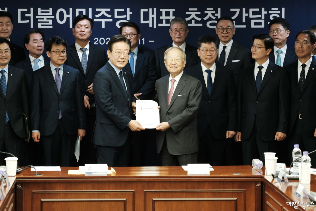 경총은 11일 오전 서울 마포구 한국경총 8층 회의실에서 ‘이재명 더불어민주당 대표 초정 간담회’를 열었다. 이날 간담회에는 이재명 대표와 손경식 회장을 포함해 진성준 정책위의장·안호영 국회 환경노동위원회 위원장·조승래 수석대변인·이정문 정책위 수석부의장·김주영 환노위 야당 간사·이해식 당대표 비서실장·김태선 당대표 수행실장 등이 참석했다.