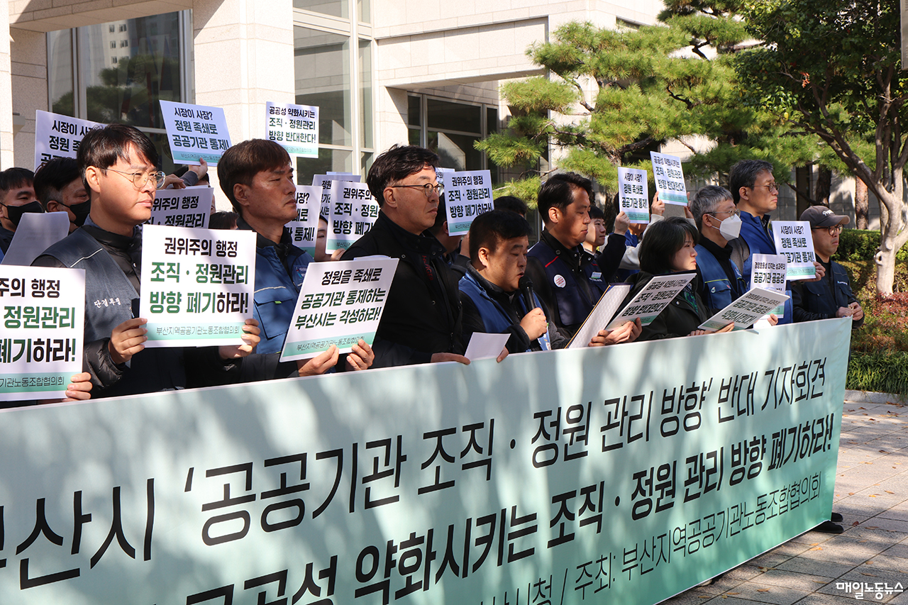 협의회는 또 “부산시 ‘공공기관 조직·정원 관리 방향’은 해당 기관의 경영 효율성만을 우선 평가하고, 정원이라는 족쇄로 지방공공기관을 옥죄겠다는 것”이라며 “공공기관의 공익성과 공공성을 강화하고 운영의 민주화를 위해 ‘공공기관 조직·정원 관리방향’을 즉각 폐기하라”고 촉구했다.