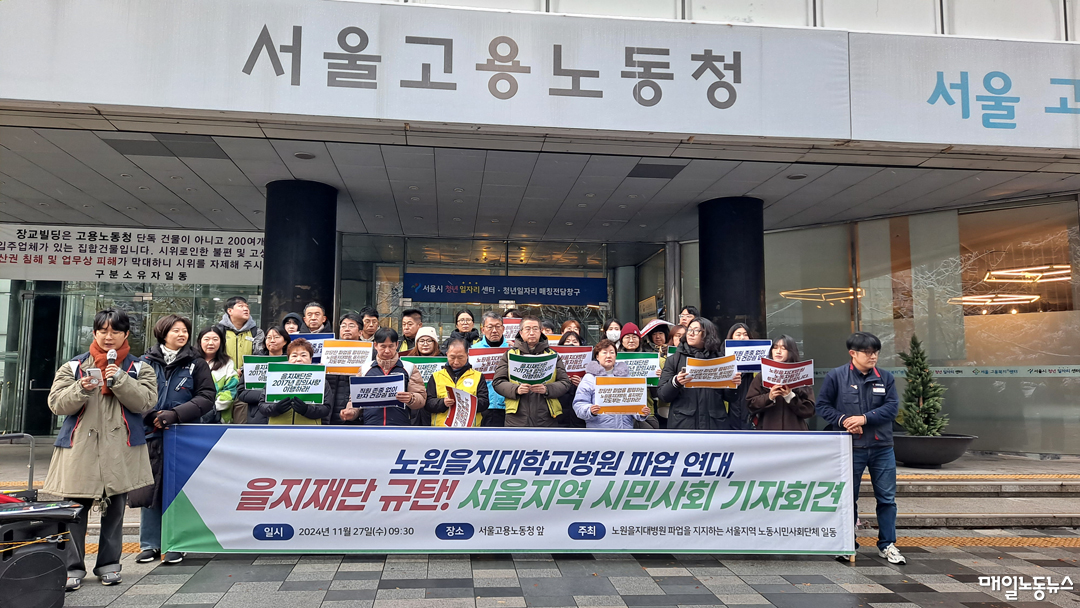 이날 오전 민주노총 서울지역본부와 너머서울 등 서울지역 179개 노동·시민단체는 서울 중구 서울지방고용노동청 앞에서 기자회견을 열고 “병원측이 열악한 노동환경을 방치하고, 의료 인프라 투자에 인색해 환자의 안전과 건강권이 위협받고 있다”며 “특히 병원장은 아무런 결정권도 없고 진짜 사용자인 을지재단 회장은 사태 해결의 의지를 보이지 않고 있다”고 지적했다. 이어 “병원과 재단측이 장기파업 사태를 방치한다면 노사 문제가 사회 문제로 비화되고 병원에 신뢰 하락을 가져올 것”이라며 조속한 사태 해결을 촉구했다.