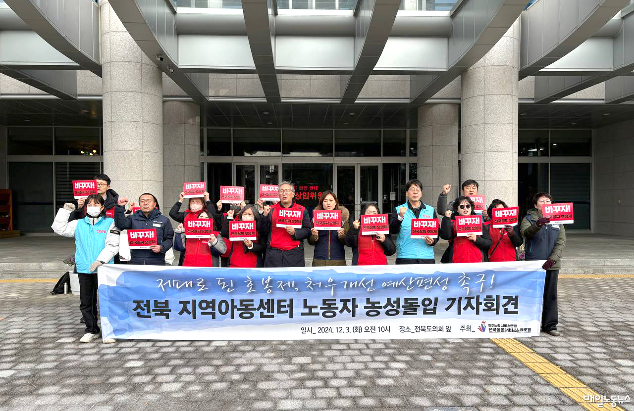 전국돌봄서비스노조는 3일 오전 전북도의회 앞에서 기자회견을 열고 “지난 9월 전북 지역아동센터 노동자들이 노조에 가입하고 전북도청 앞 기자회견, 국회 소통관 기자회견, 증언대회 등 우리의 현실을 알려왔지만 우리들에게 정작 들려오는 것은 기다려달라는 말뿐”이라며 “제대로 된 호봉제 실현을 약속받을 때까지 농성을 이어갈 것”이라고 밝혔다. 이들은 18세 미만 초·중·고 아동에게 교육·돌봄을 제공하는 돌봄교사·사회복지사로 지역아동센터에서 일한 노동자들이다.