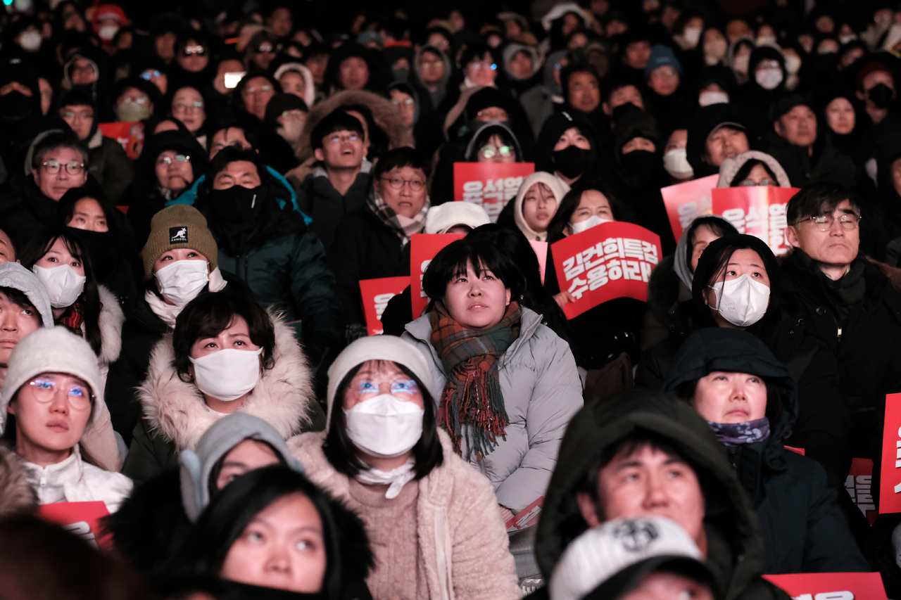 5시 본회의가 시작되자 서 있던 시민들도 자리에 앉아 숨죽이고 표결을 바라봤다. 집회방송 모니터를 바라보는 표정은 간절했다. 모니터가 보이지 않는 시민들은 스마트폰으로 유튜브 생중계를 봤다. 많은 인파로 통신이 지연돼 이마저도 할 수 없었던 시민들은 일면식도 없는 시민의 유튜브를 함께 시청하거나 귀를 쫑긋하며 들었다. 김건희 특검법 표결 이후 국민의힘 의원들이 단체로 퇴장한다는 소식을 접한 시민들은 격한 반응을 쏟아냈다. 당장 국민의힘 당사로 가자는 시민들도 여럿 있었다. 표결 절차를 잘 알지 못한 시민들은 동료시민에게 상황을 묻기도 했다. 연인으로 보이는 한 시민은 “이래서 국민의힘은 믿으면 안 된다니까” “설마 8명이 없겠어” 같은 대화를 나눴다. 시민들은 박찬대 더불어민주당 원내대표가 탄핵안 가결을 호소하며 국민의힘 의원 이름을 하나하나 호명할 때마다 따라서 외치기도 했다.
