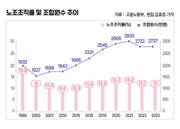 2004년부터 10%대를 유지해 오던 노조조직률은 문재인 정부 시절인 2020년 14.2%까지 올랐다. 14%대에 이르던 노조조직률은 윤석열 대통령이 취임한 2022년 13.1%로 떨어졌고 지난해 간신히 13%를 유지했다.
