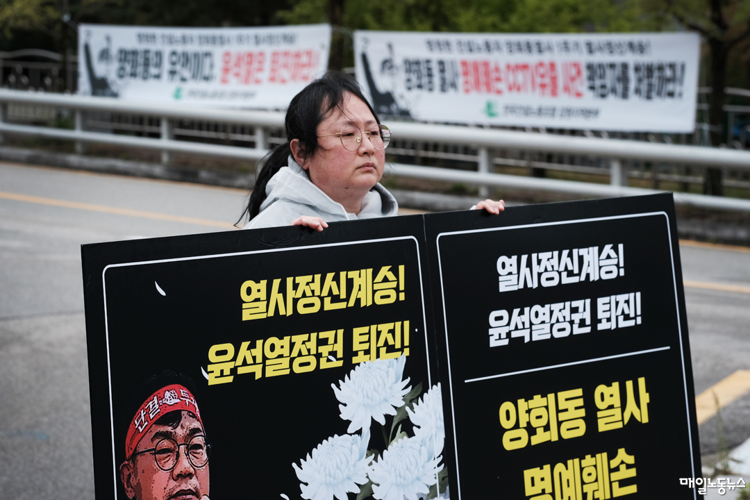 “춘천에서는 한 달에 세 차례 정도 하고 있고, 서울경찰청 앞에서 한 달에 한 번가량 하고 있다. 남편이 촛불단체 회원이었다. 그래서 서울에서 촛불단체가 같이 해 주고 있고, 노조에서도 같이 참여해 주고 있다. 진척이 별로 없다. 1인 시위를 한다고 해서 윤석열을 당장 끌어내릴 수 있을 것이라는 마음으로 시작한 건 아니지만 막막하고 답답하다. 길게 갈 싸움인 것을 알고 있지만, 한편으로는 막막하다.”