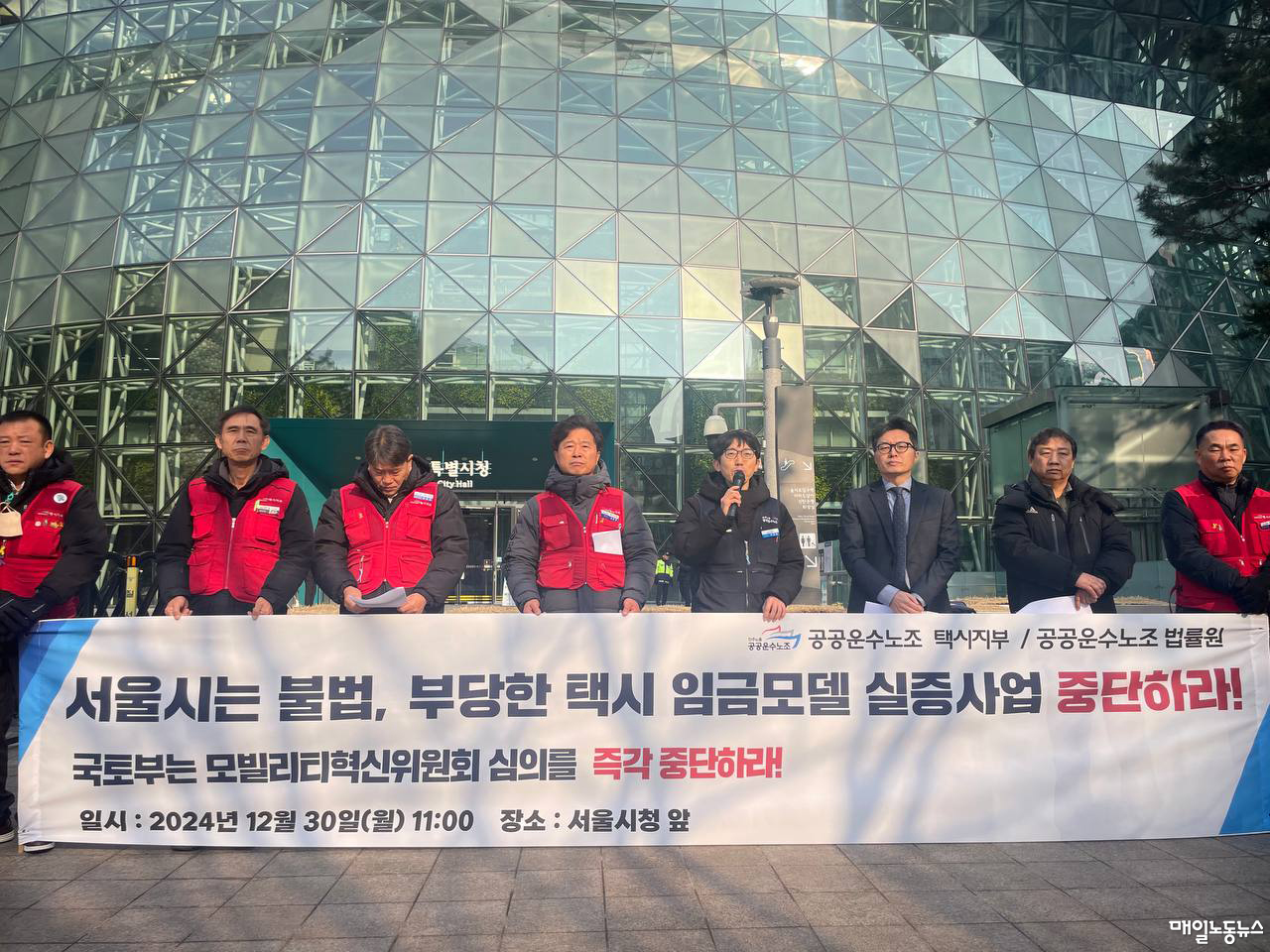 공공운수노조 택시지부(지부장 김종현)는 30일 오전 서울시청 앞에서 기자회견을 열고 “서울시는 불법·부당한 법인택시 임금모델 사업을 즉각 중단하고, 국토교통부는 모빌리티 혁신위원회 심의를 중단하라”고 밝혔다.