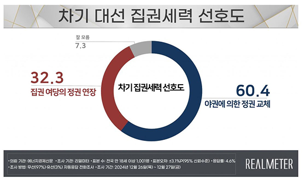여론조사 전문기관 리얼미터가 에너지경제신문 의뢰로 지난 26~27일 전국 18세 이상 유권자 1천1명에게 차기 대선 집권세력 선호를 조사한 결과 ‘야권에 의한 정권교체’ 의견이 60.4%로 가장 많았다. ‘집권여당의 정권연장’은 32.3%를 기록했다. 두 의견 간 차이는 28.1%포인트로 정권교체론이 우세하게 나타났다. ‘잘 모름’은 7.3%였다.<그래프>
