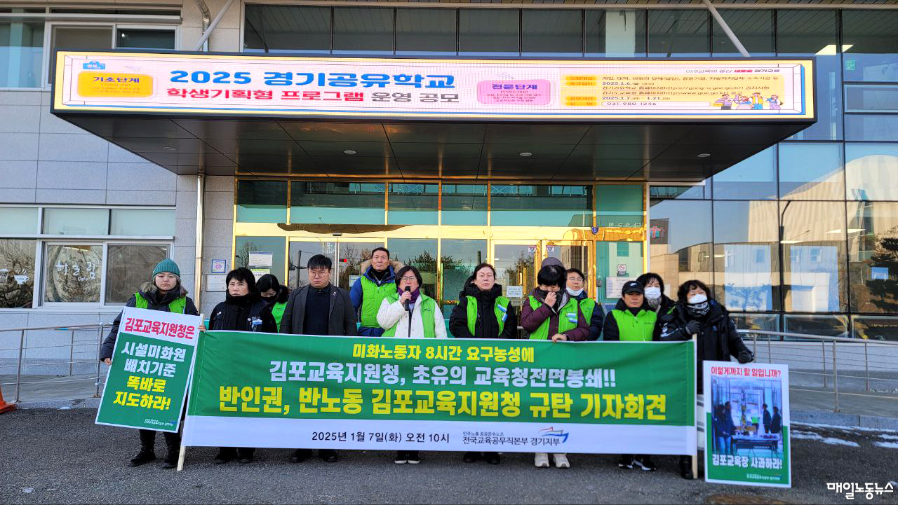공공운수노조 교육공무직본부 경기지부는 7일 오전 경기 김포시 김포교육지원청 앞에서 기자회견을 열고 “청사 봉쇄로 노조 집행부를 감금한 반인권·반노동 김포교육지원청을 규탄한다. 노조를 적대시하는 김포교육장은 사과하라”고 촉구했다.